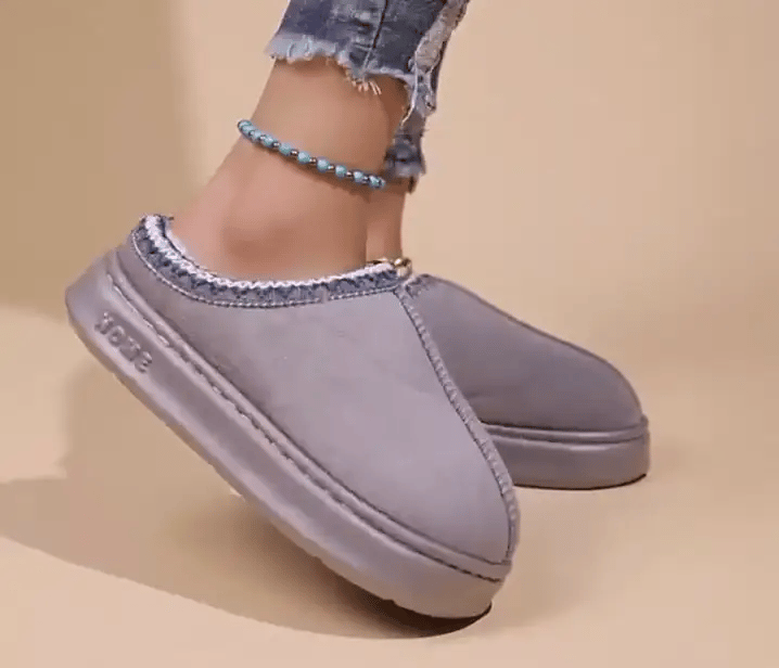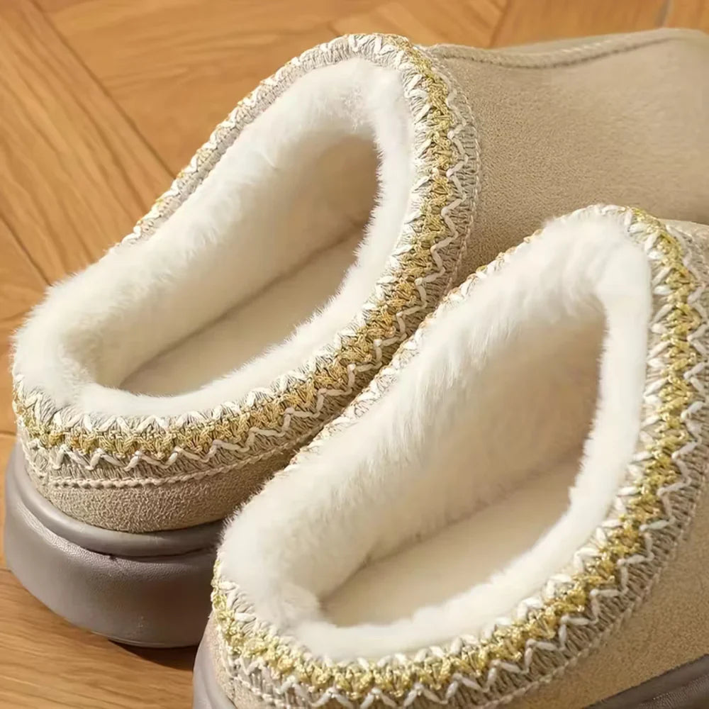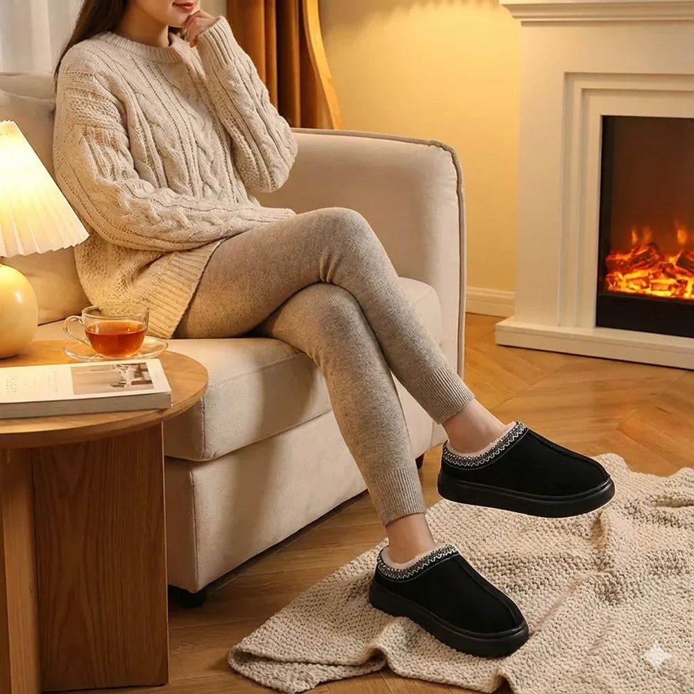 Las costuras decorativas refuerzan la estructura del zapato mientras añaden un toque elegante de invierno. Su silueta casual hace que sea fácil de combinar tanto con atuendos de casa como con looks relajados para el exterior.